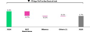 lower-risk vintages’ share of the portfolio mix. QoQ, provisions increased 4.8%. Cost of Risk declined 71 bps YoY to 1.7%, while Risk-Adjusted NIM reached