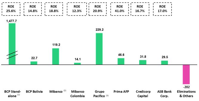 Net income attributable to Credicorp increased 14.1% YoY and declined 4.6% QoQ to S/1,738.7 million, with ROE at 19.6% driven by contributions from all lines of