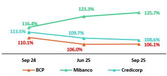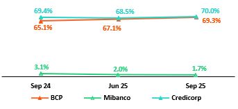 Provisions declined by 30.5% YoY, driven by BCP and Mibanco, which registered improvements in payment performance due to economic recovery and an increase in